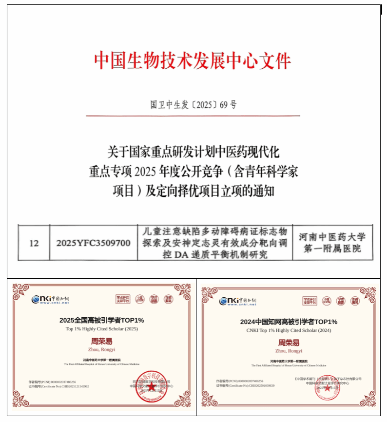 本网讯(文/图 韩姗姗)近日,中国生物技术发展中心正式公布2025年度国家重点研发计划“中医药现代化”专项(含青年科学家项目)立项通知,河南中医药大学第一附属医院儿科医院周荣易教授作为负责人获批“儿童注意缺陷多动障碍病症标志物探索及安神定志灵有效成分靶向调控DA递质平衡机制研究”项目!同时,在近日中国知网公布的全国高被引学者名单中,凭借深厚的学术积淀与卓越的研究成果,周荣易教授连续入选2024、2025年度全国高被引学者TOP1%。