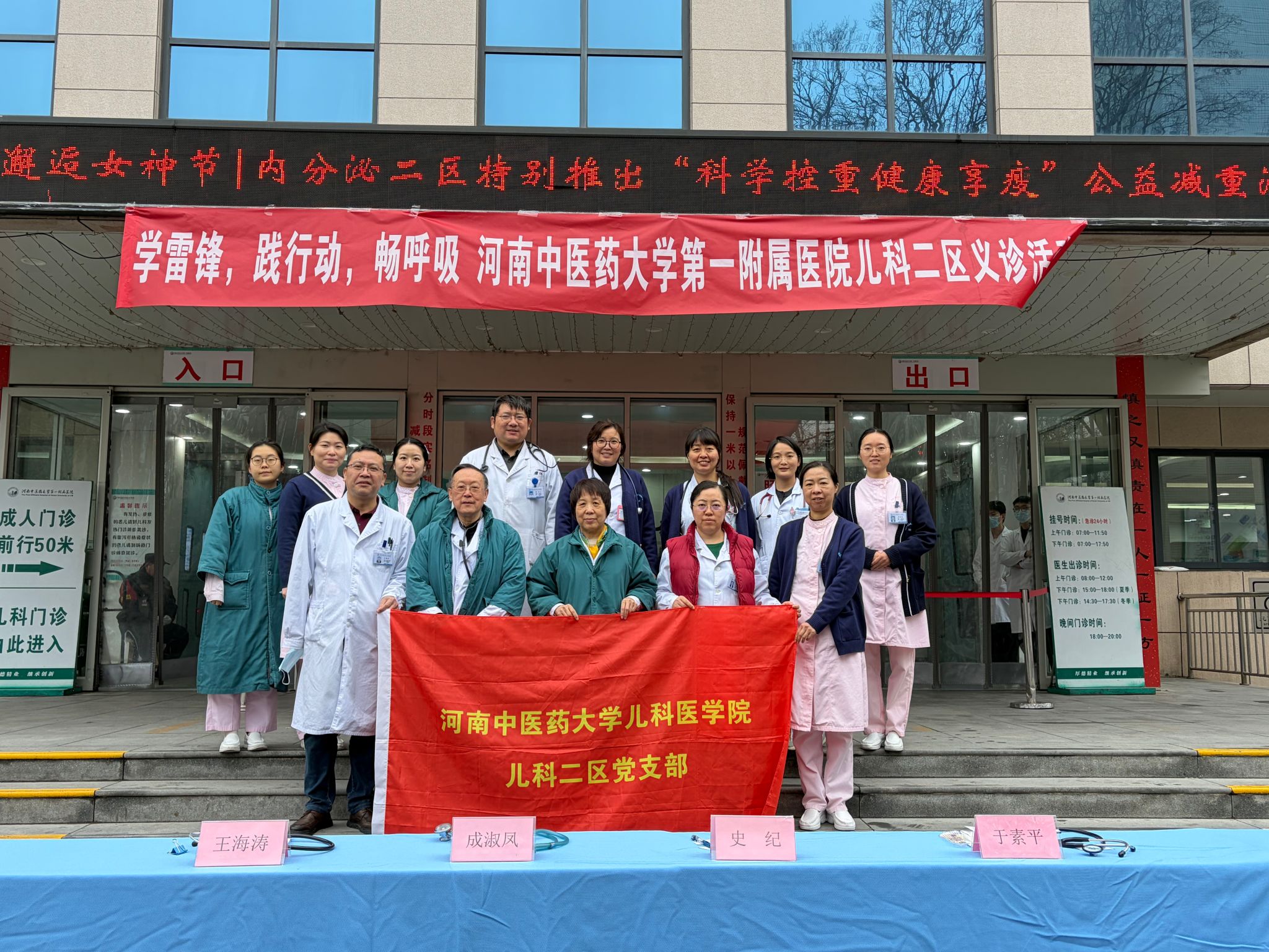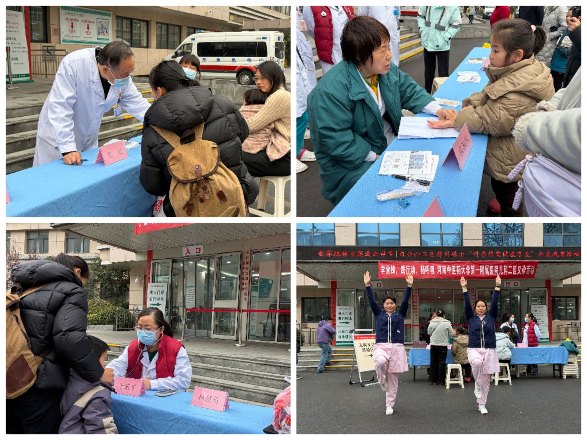 2026年3月5日上午,儿科二区在人民路院区2号楼前广场,举办“学雷锋 践行动 畅呼吸”主题义诊活动。二区党支部组织史纪教授、成淑凤教授、于素平主任医师、王海涛副主任医师、赵文静护士长等医护专家团队带领儿科研究生志愿者,针对儿童反复咳喘、反复呼吸道感染等常见疾病,为广大儿童及家长提供了专业的健康咨询与诊疗服务。同时现场开展推拿、呼吸操演练教学,帮助家长掌握居家护理的实用技巧,将中医“治未病”的理念融入日常育儿之中。